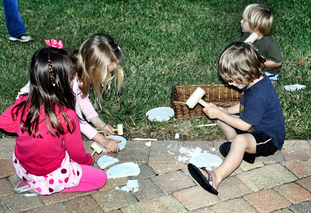 For the party favors we took jewelry charms and stones and buried them in plaster of paris. We used food tins for the mold and after they dried popped them out and put each child's name on it. I put some wooden mallets and picks out and the kids had a great time digging out their buried treasure. When they were finished I put out supplies so they could use their treasures to make a necklace or bracelet.